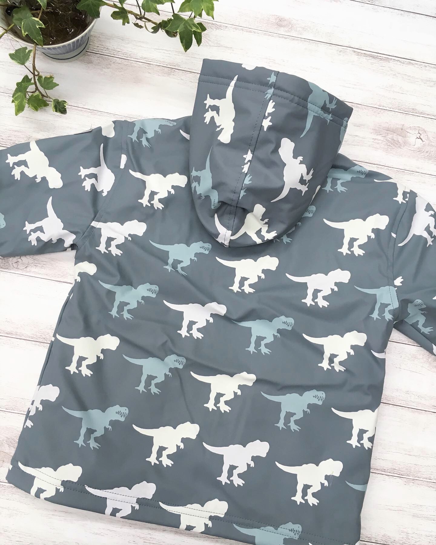 緑がかったグレーに恐竜のイラストがプリントされたレインコート。