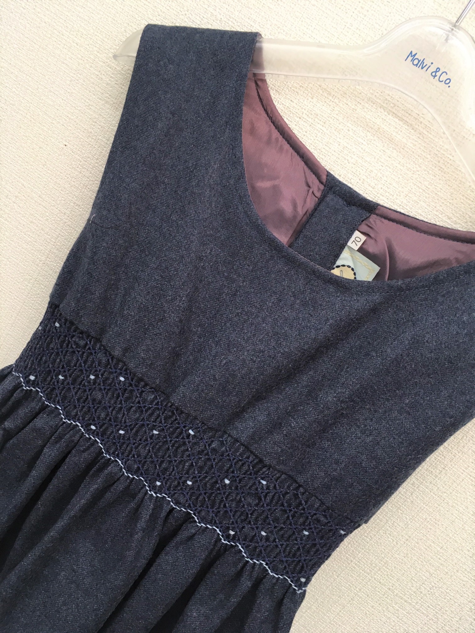 幅6㎝のハンドメイドのスモッキング刺繍が上品です。