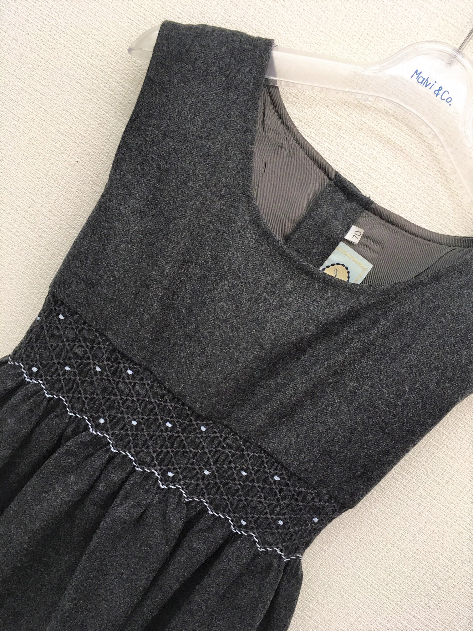 幅5㎝のハンドメイドのスモッキング刺繍が上品です。