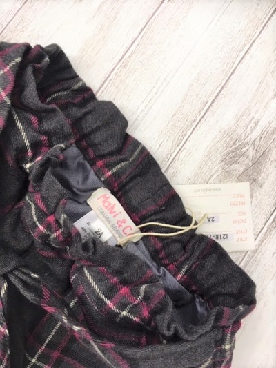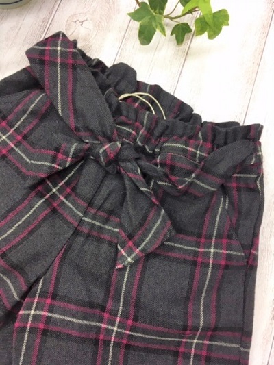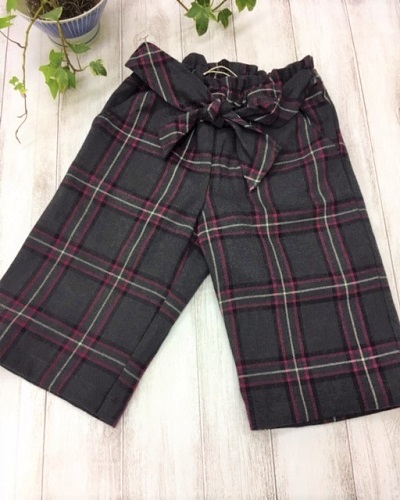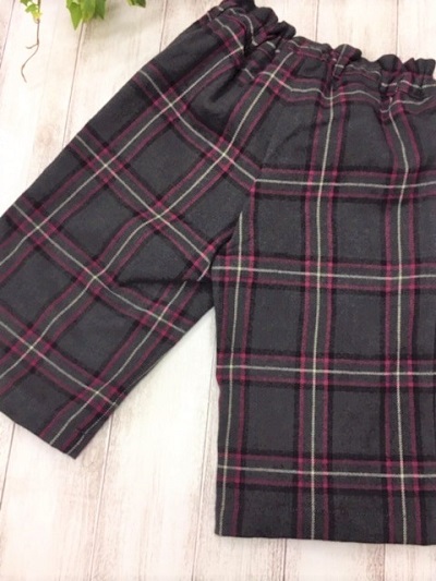 グレー×マゼンタ色のタータンチェックの七分丈パンツ。