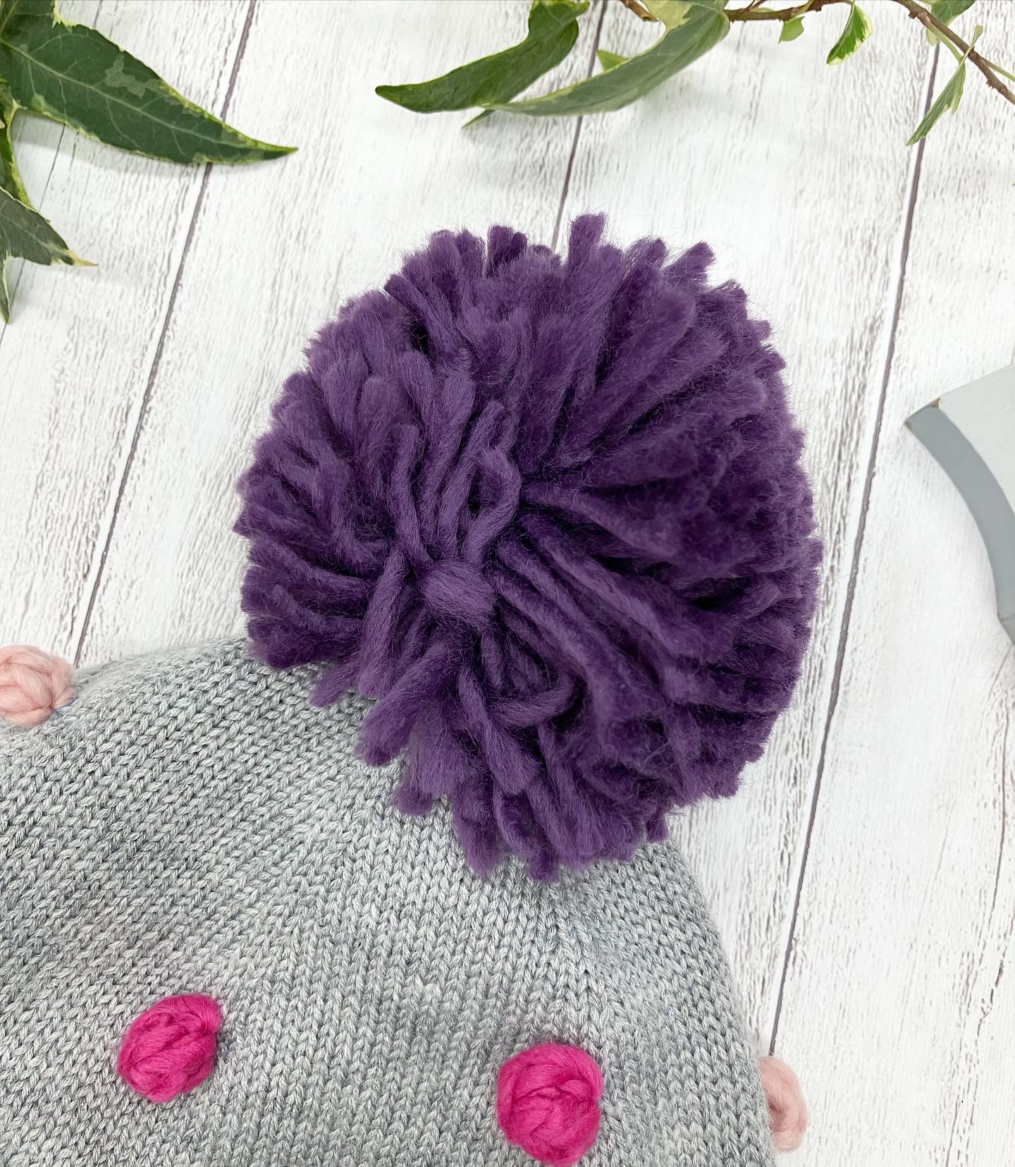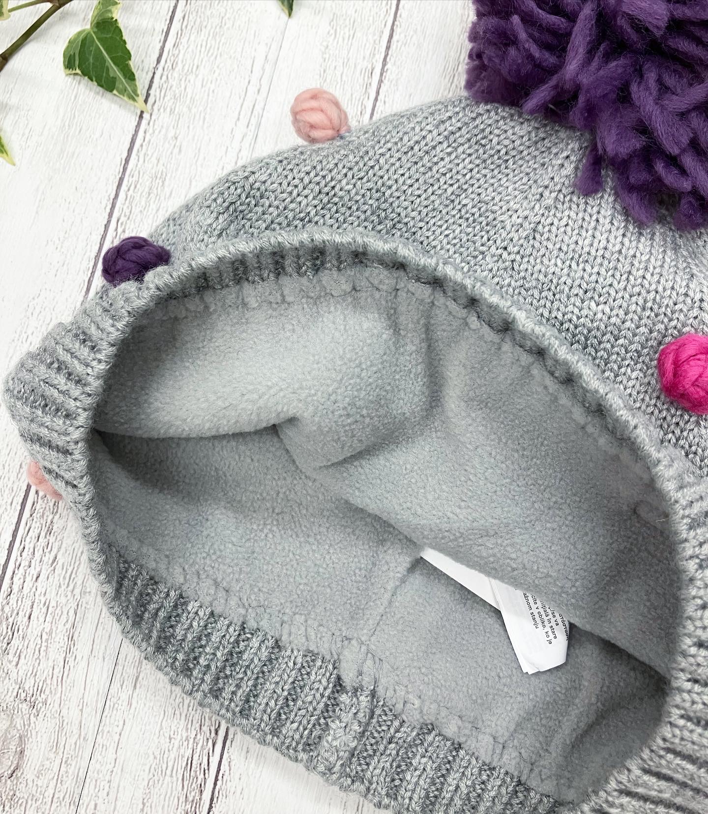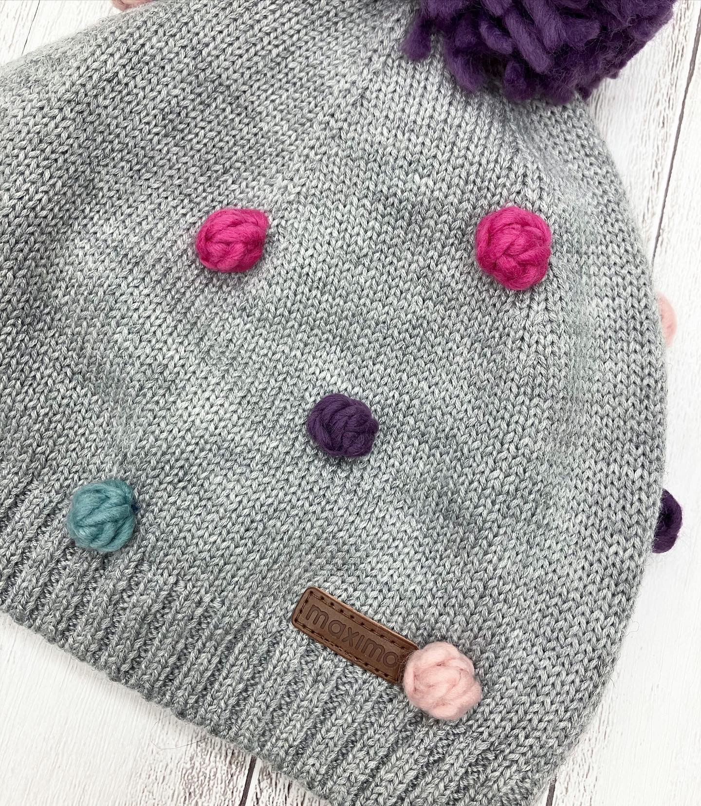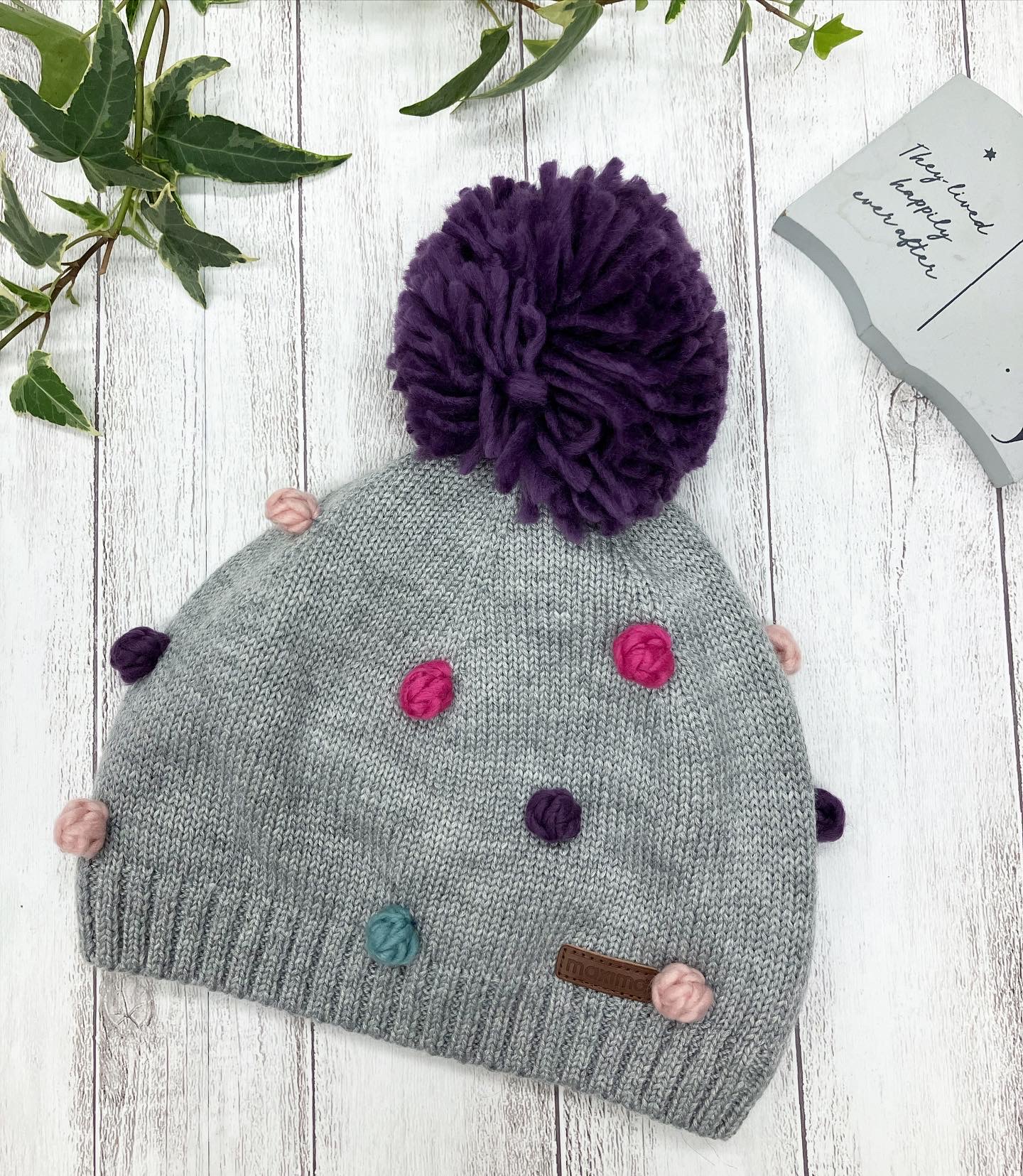 立体的なボンボンが散りばめられた可愛いニット帽。