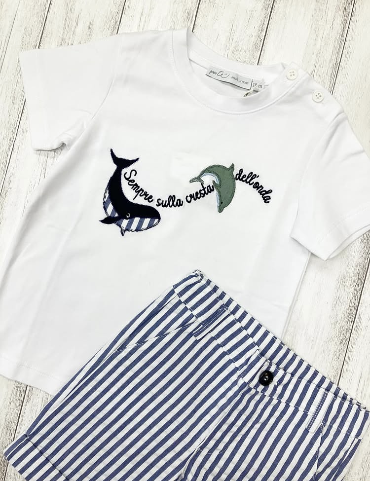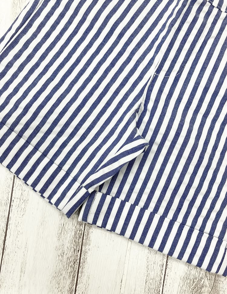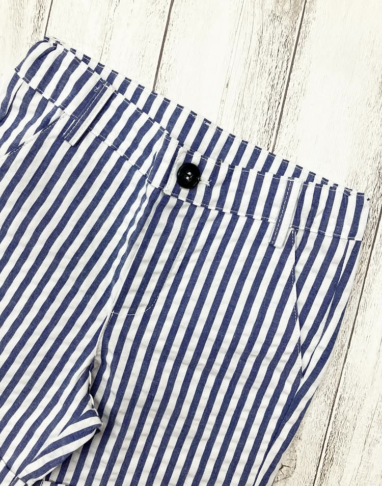 白とブルー(明るめの紺)の爽やかなストライプ・ショートパンツ。