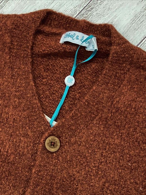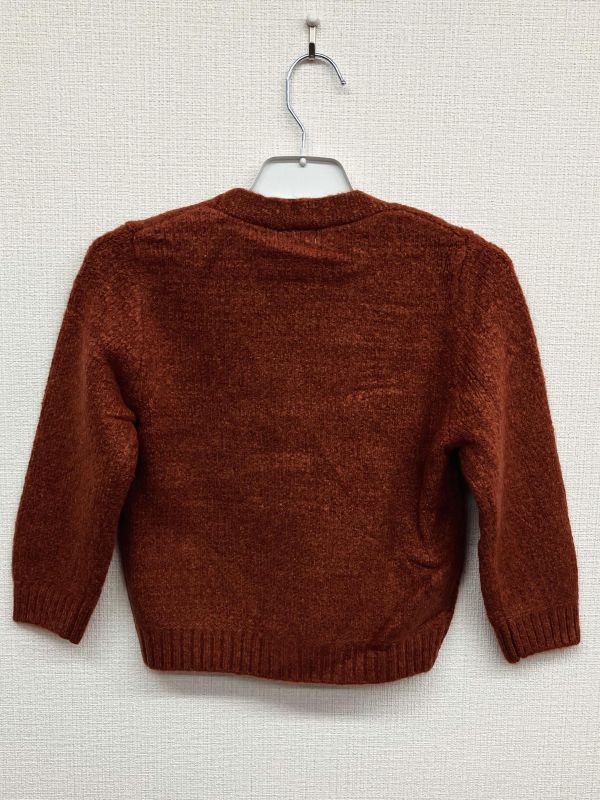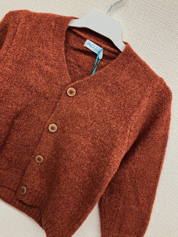 赤茶色のたっぷりとしたシルエットのVネックカーディガン。