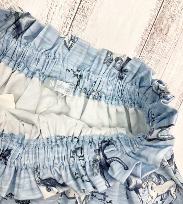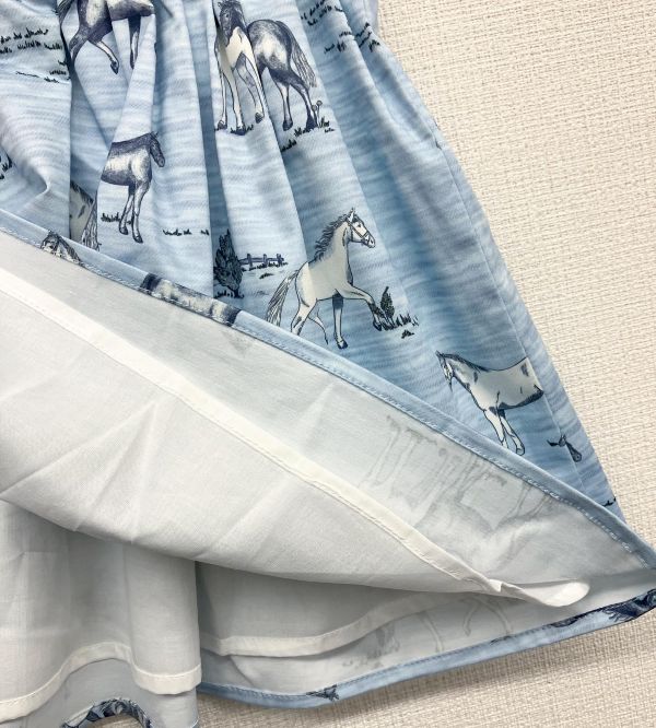 ヨーロッパらしい落ち着いたブルーグレーの生地に馬のイラストがプリントされた