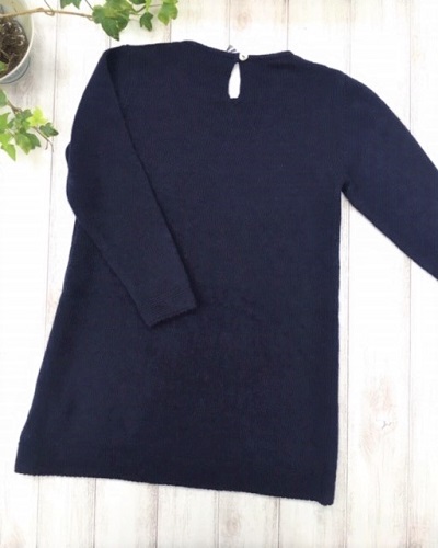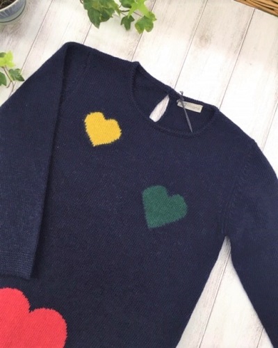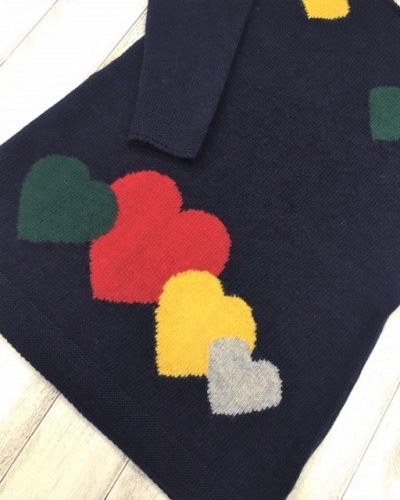 紺地に赤・グリーン・イエロー・グレーのハートマークが可愛いニットワンピース。