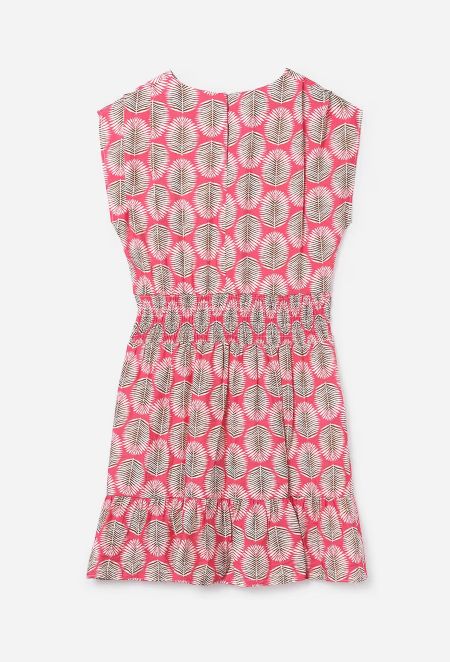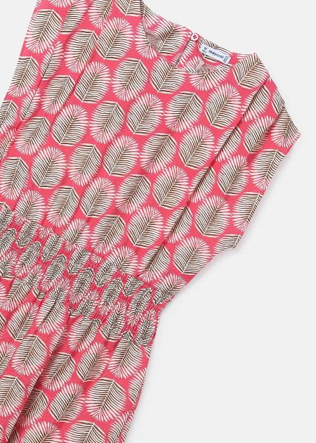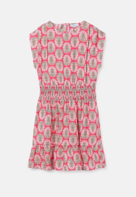 綺麗なピンクに葉のイラストがリゾート気分なデザインのワンピース。
