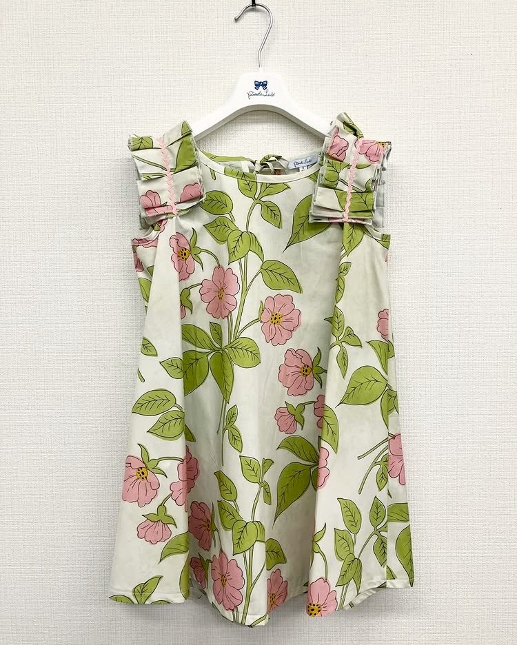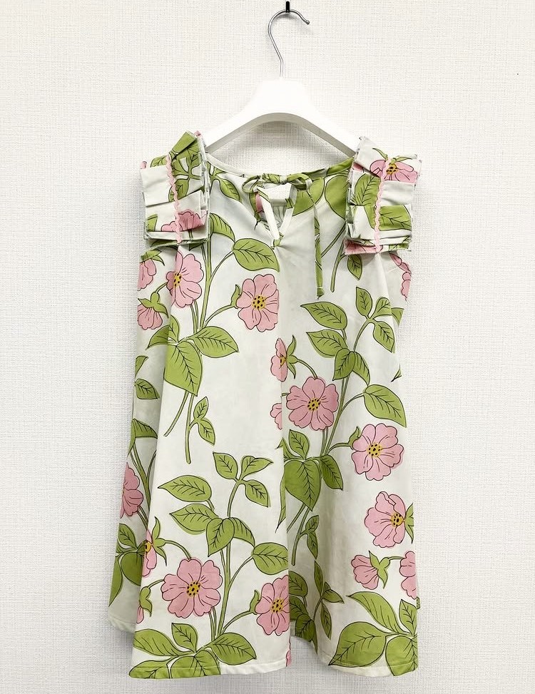 肩にボリュームのあるフリルが可愛いフラワーワンピース。