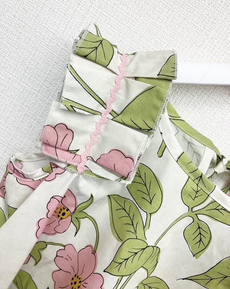 ノースリーブの袖周りにはたっぷりとしたフリルがアクセントに。