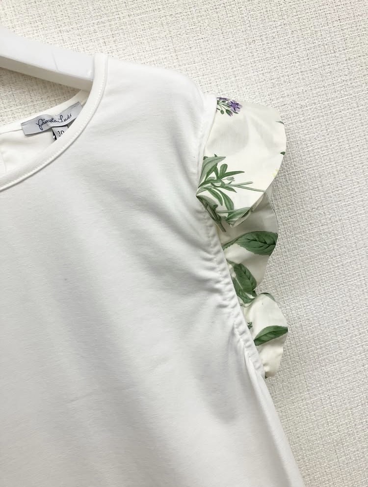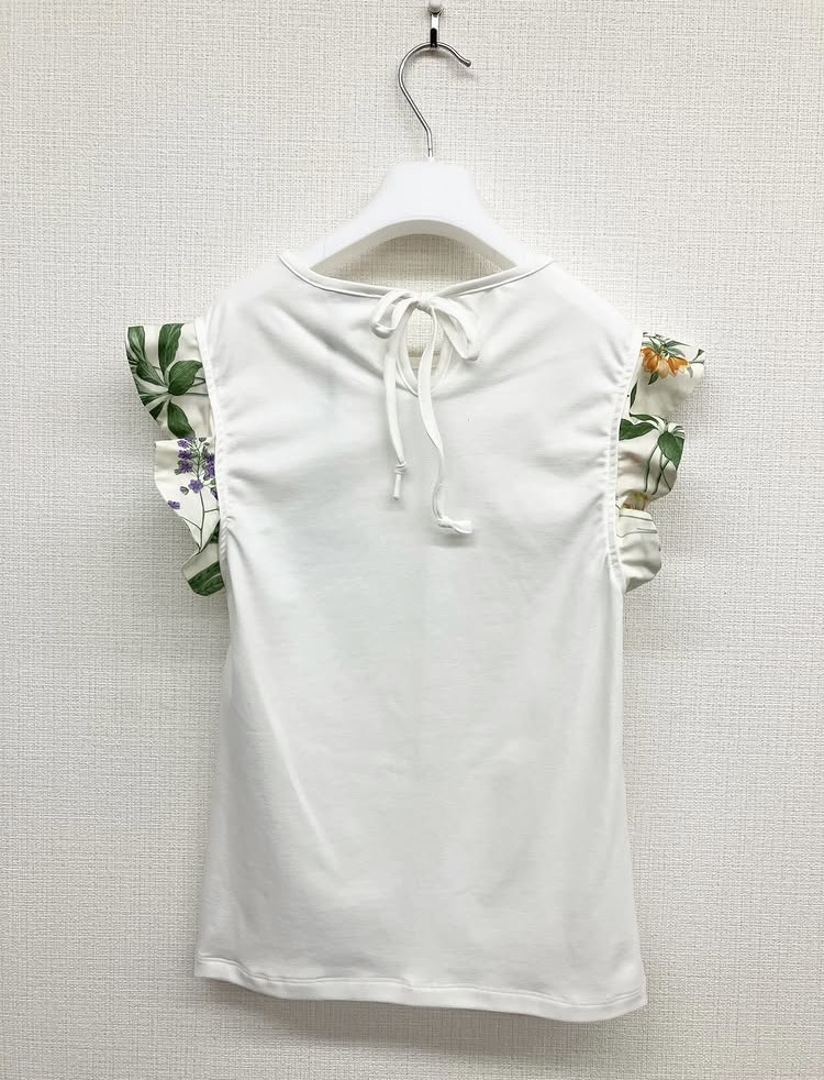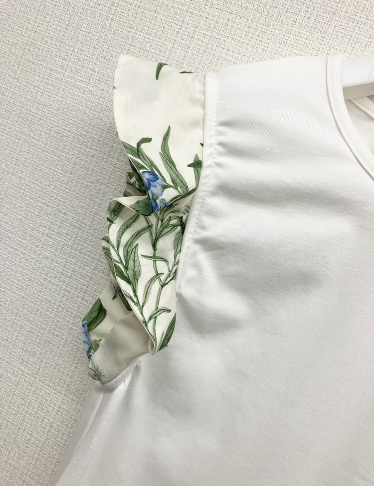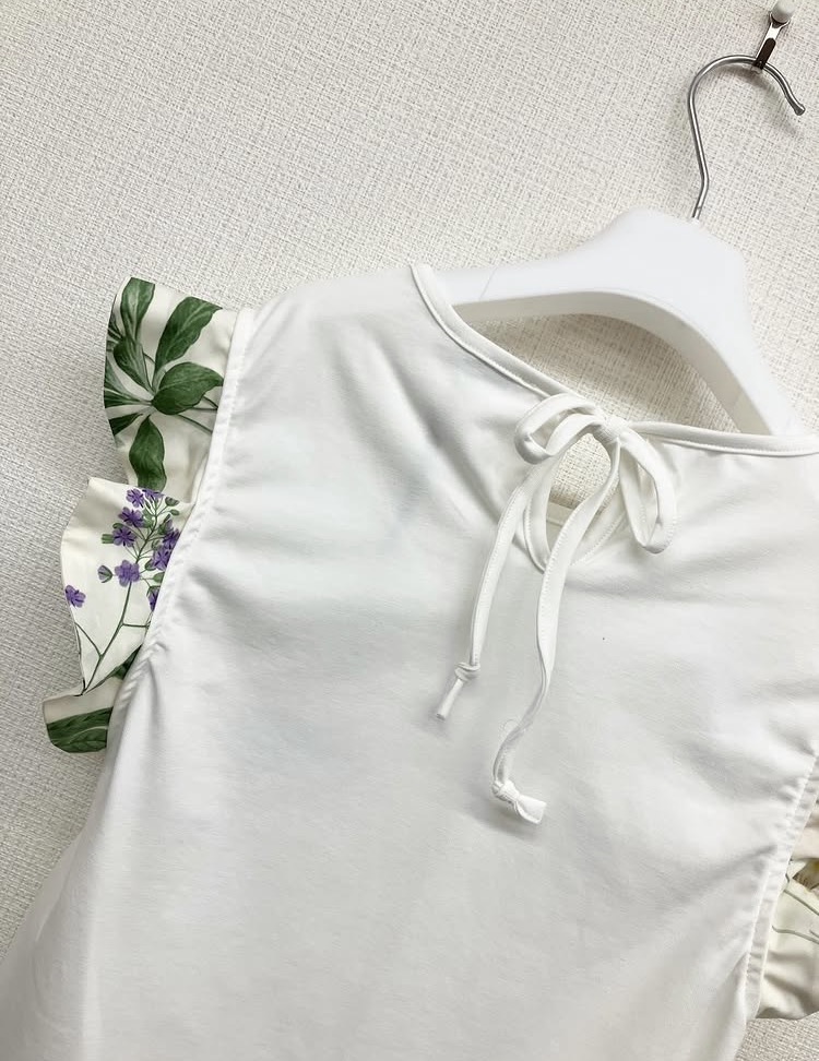 夏の庭を感じさせるボタニカルプリントを使用したフリル。